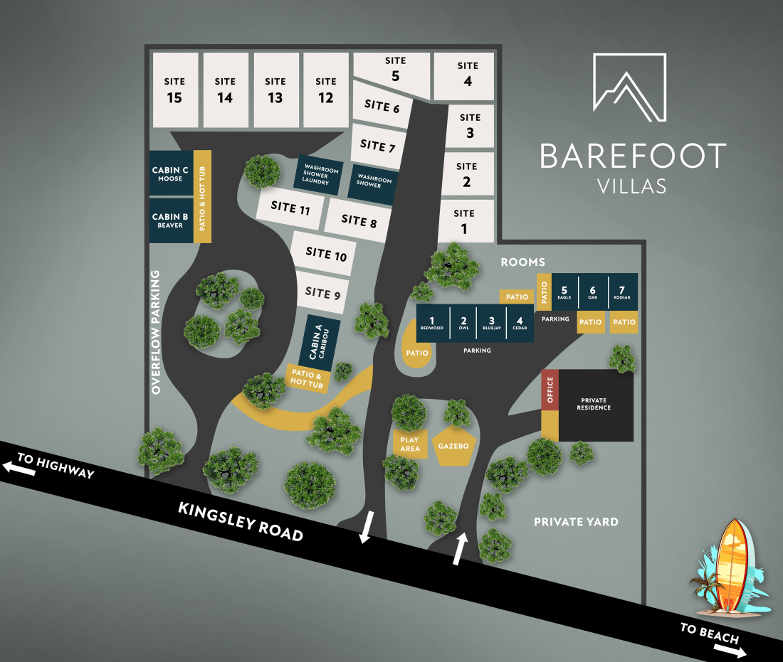 Our property map shows the location of all motel rooms, cabins, and RV sites so you can easily find your way around.